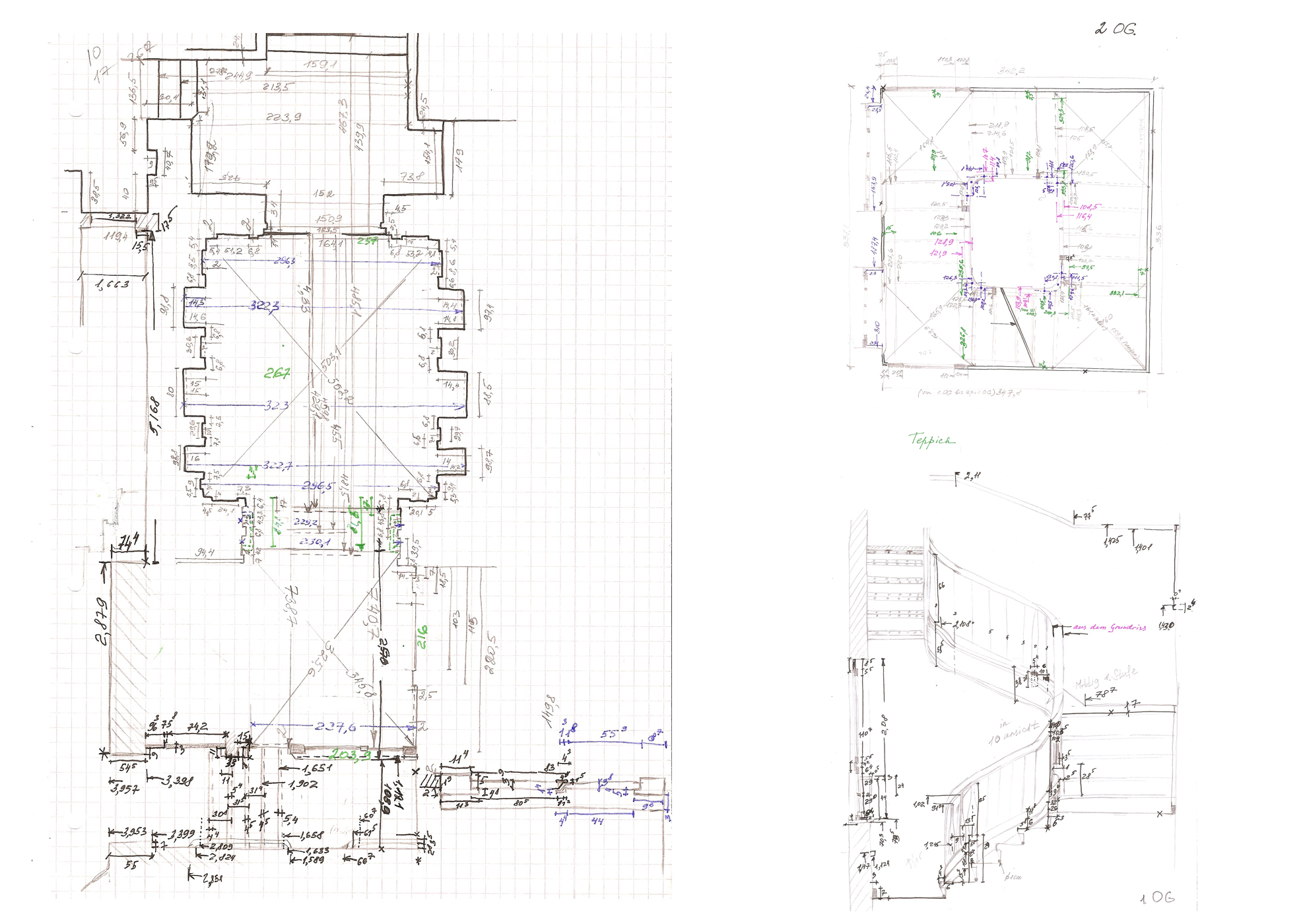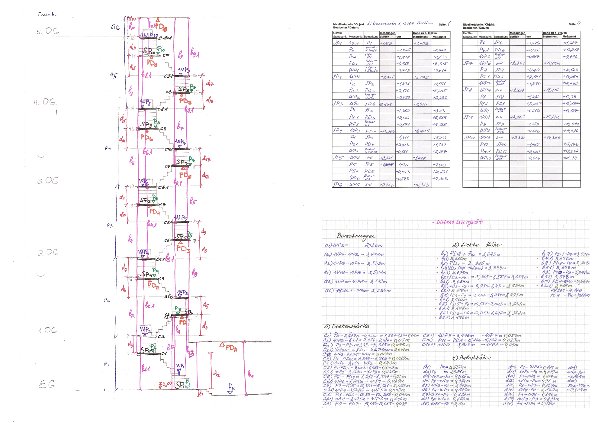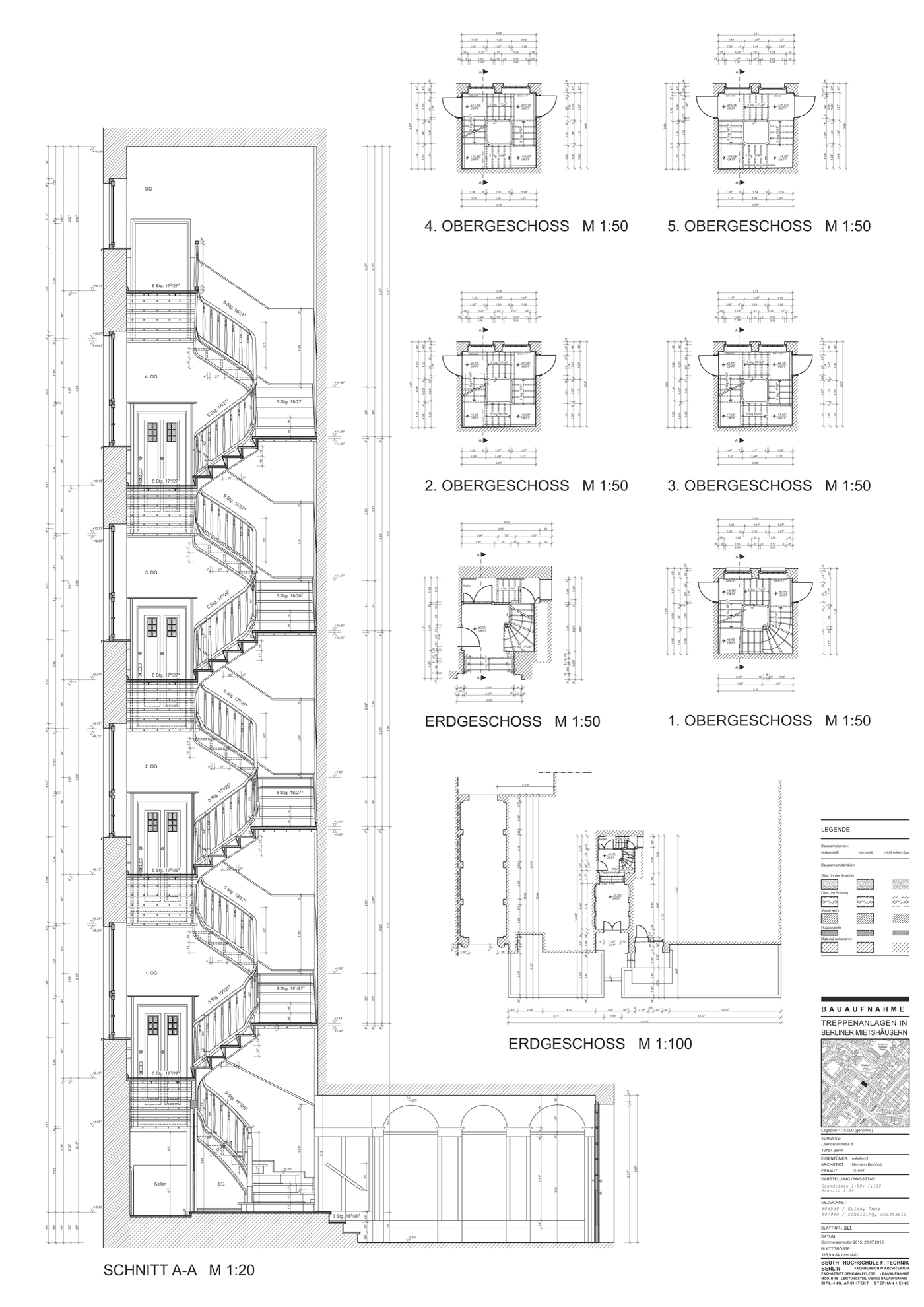 Der Gegenstand dieser Arbeit beinhaltet das Aufmass einer Treppe in einem Berliner Mietshaus aus der Zeit vor 1945. Ausgewählt wurde die vierläufige Treppe im Haus 8 in Liliencronstraße aus dem Baujahr 1910-1911 vom Architekt Hermann Buchholz. Zur Bestimmung der Podesthöhen wurde Höhennivellement durchgeführt und eine Nivelliertabelle erstellt. Als Grundlage für die Zeichnungserstellung (neben der Auswertung der Nivelliertabelle) dienten mehrere Handskizzen, die mithilfe von unterschiedlichen Aufmassmethoden vor Ort erfasst/angefertigt wurden. Die Arbeit wurde in einer 2-er Gruppe ausgeführ.