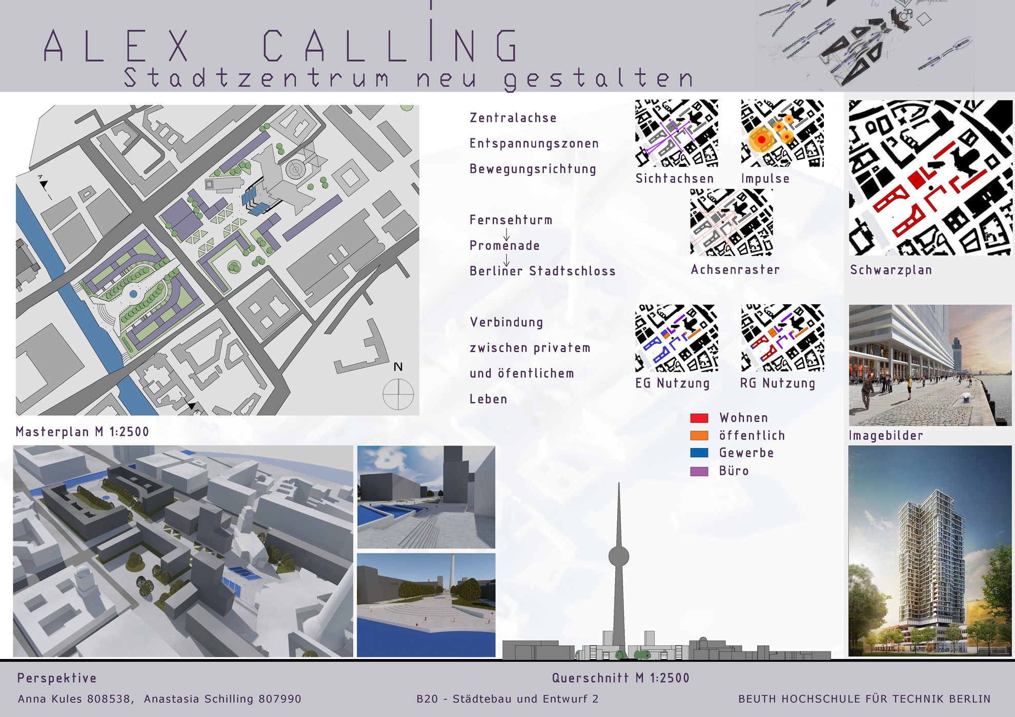 Der Alexanderplatz in Mitte Berlins bleibt einer der beliebtesten und meistbesuchten Orte der Stadt. Der Ortsteil rund um den in unmittelbarer Nähe liegenden Fernseherturm war in früheren Zeiten noch vor dem Zweiten Weltkrieg dicht bebaut und bewohnt. Heute jedoch ist es ein untergenutzter Platz, der dringend neue städtebauliche und architektonische Lösungen braucht. Mit dem Projekt "Alex calling" wurde nach dem Vorbild Berlins Anfang des 20. Jahrhunderts versucht, diesen Ort zum Leben zu erwecken. Der Mix aus unterschiedlichen Nutzungen und Gebäudeformen schafft es, den Alexanderplatz neu zu interpretieren. Dabei entstehen neue Promenade, zusätzliche öffentliche Treffpunkte, Büro-, Gewerbe- und Wohnflächen. Die Arbeit wurde in einer Gruppe von zwei Personen ausgeführt.