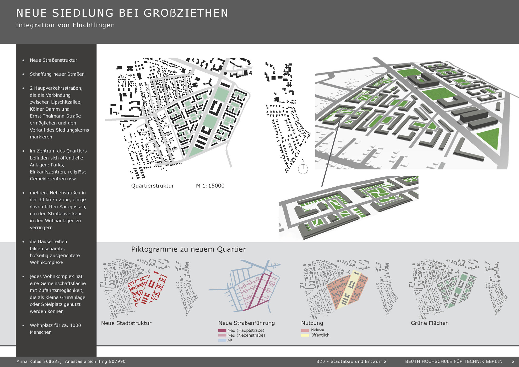 Die extreme Not an Wohnflächen, die mit der 2015 in Europa begonnenen Flüchtlingskrise zusammenhängt, hat natürlich auch in der Architektursphäre große Resonanz bekommen. Es wurden vor allem billige, schnell aufbaubare und möglichst energieeffiziente Wohnmöglichkeiten benötigt. Mit diesem Projekt wurde eine der Alternativen zur Organisation ihres Lebensraumes präsentiert. Die Idee ist eine Quartierstruktur aus Kombination von öffentlichen Einrichtungen wie Parks, Einkaufmöglichkeiten, religiösen Gemeinden im Zentrum und mehreren Wohnkomplexen zu schaffen. Jedes Wohnkomplex steht für sich und bildet dabei eine Gemeinschaftsfläche. Inspiriert von dem Vortrag des Architekten Taco Holthuizen über die Aspekte der Energiewende und Grundlagen der Energiebilanz basiert das Konzept auf einer Leichtbauweise aus Holzleichtkonstruktion. Das Projekt wurde von zwei Personen ausgearbeitet.
