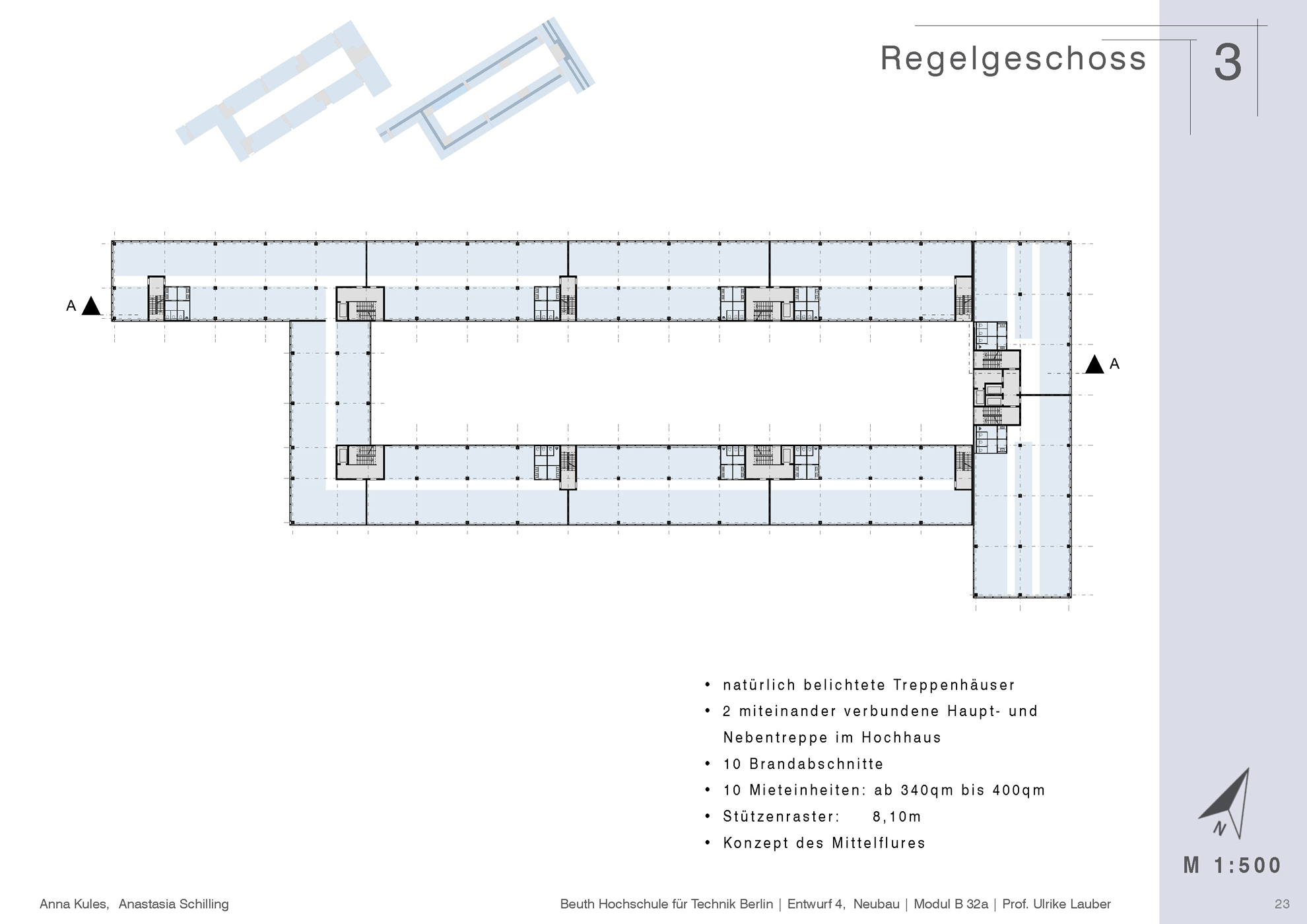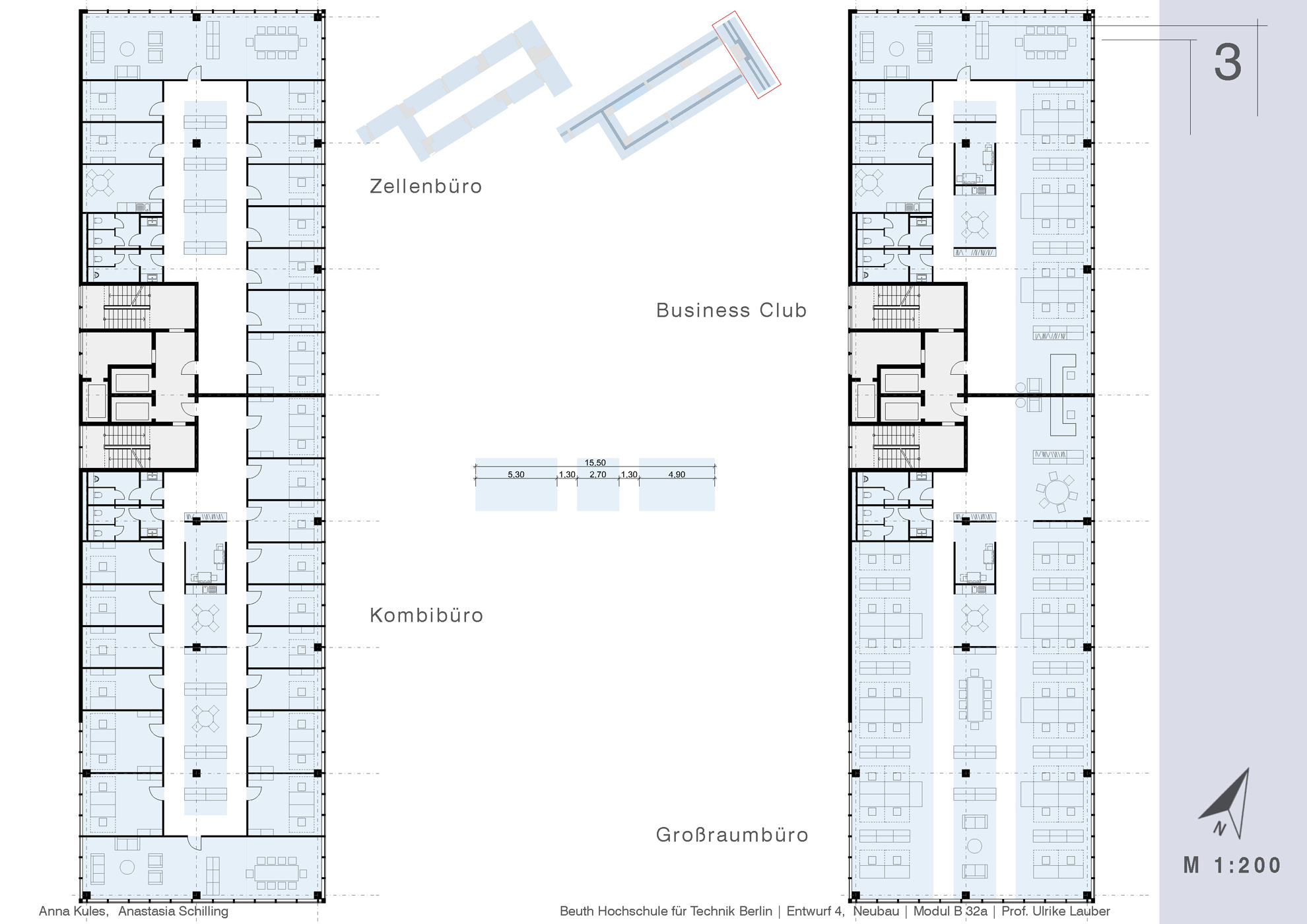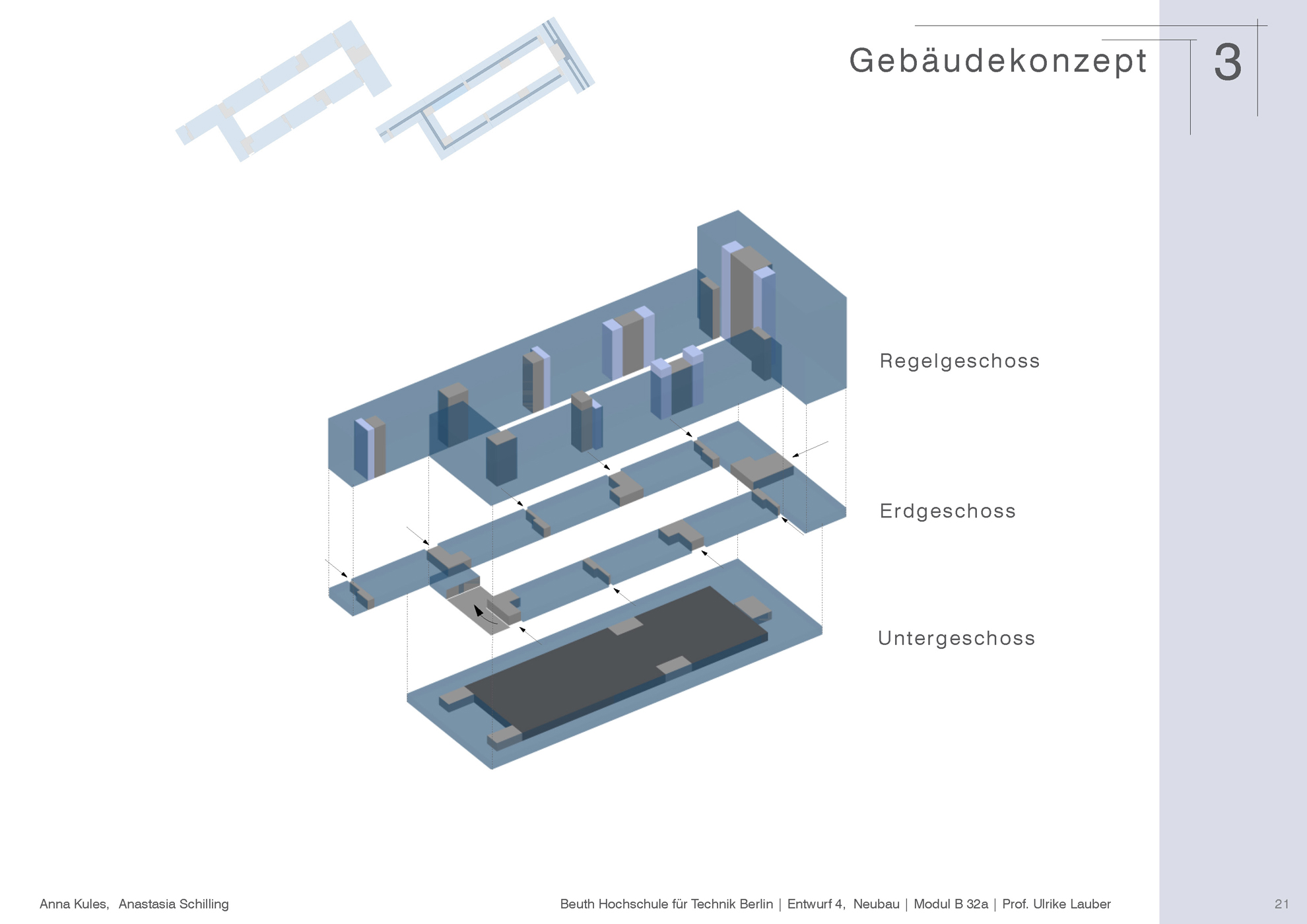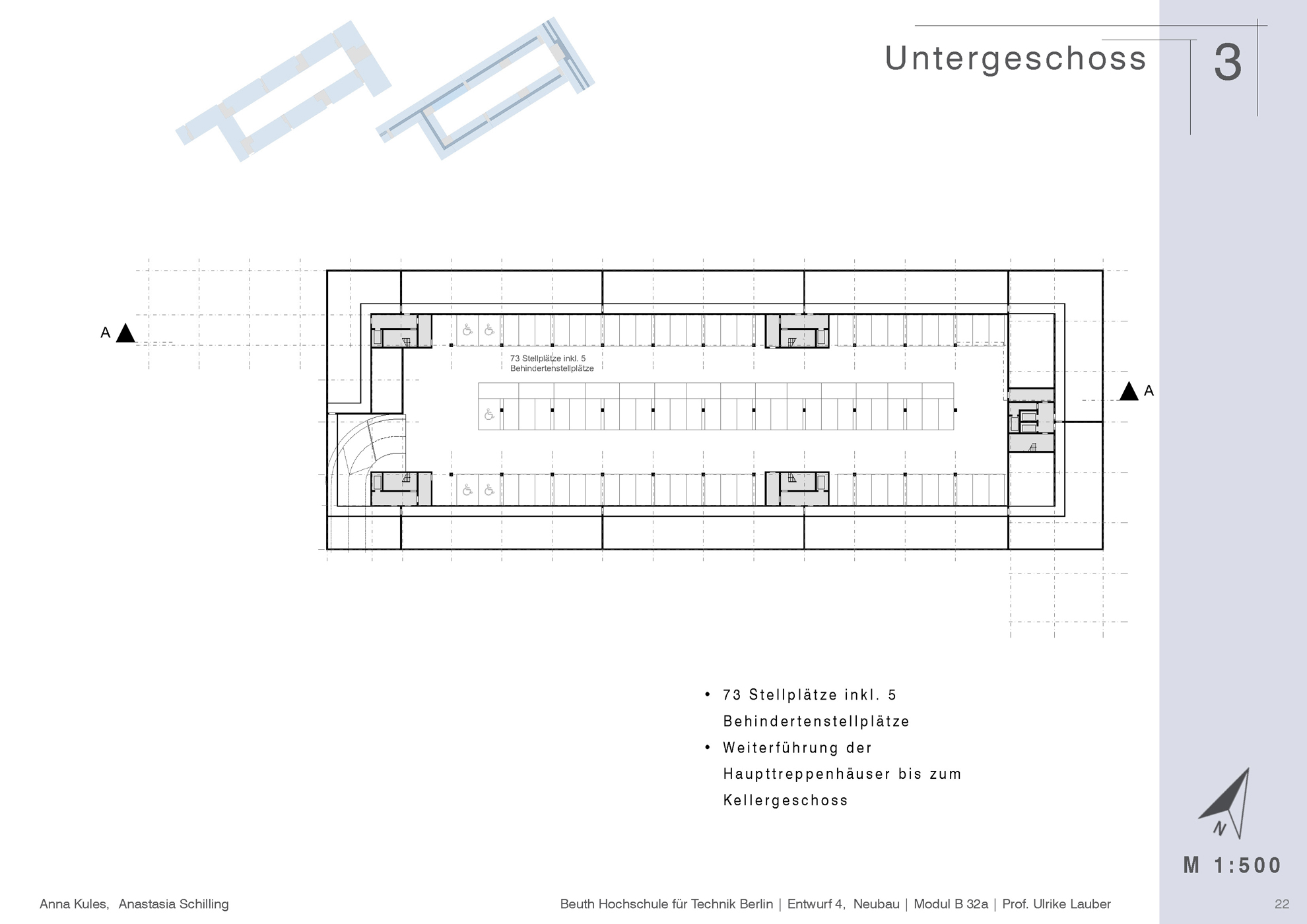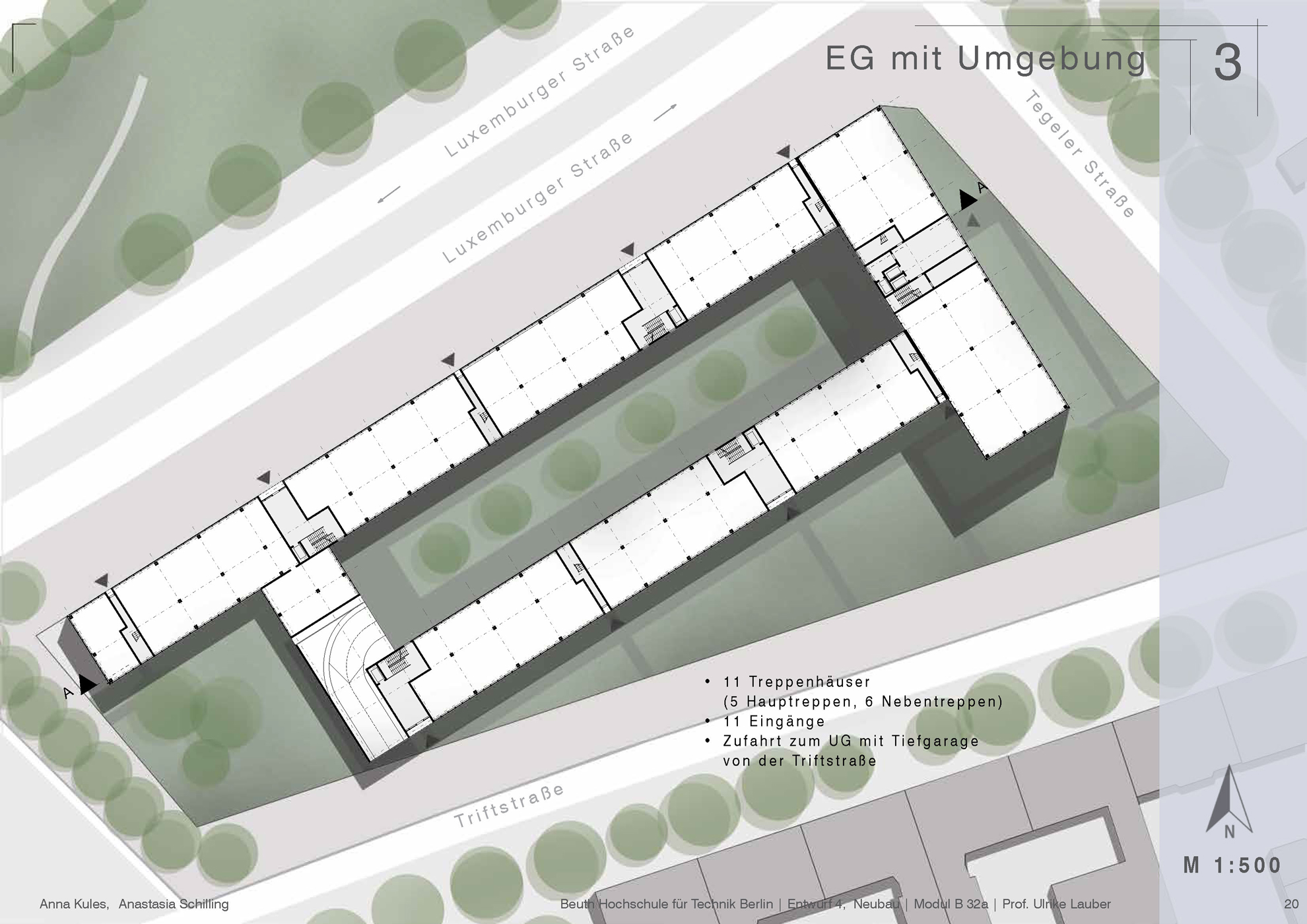 Das Grundstück in der Luxemburger Straße direkt gegenüber der Beuth Hochschule, auf dem das alte Parkhaus steht, ist städtebaulich und in seiner Substanz nicht angemessen für diese bedeutende und zentrale Lage in Berlin-Mitte | Wedding. Es sollte eine neue Baustruktur geschaffen werden, die bessere und effizientere Ausnutzung bieten kann. Auf Grundlage einer knappen Analyse des Ortes und seiner Umgebung wurden mehrere alternative städtebauliche Konzepte entwickelt, die unterschiedliche Nutzungen (Wohnen, Arbeiten) aufnehmen können. Einer der Entwürfe wurde für diese zwei Nutzungen im Maßstab 1:500 ausgearbeitet und im Anschluss für die Nutzung als Büro vertieft. Die Arbeit wurde von zwei Personen unter der Leitung von Professorin Frau Ulrike Lauber ausgeführt.