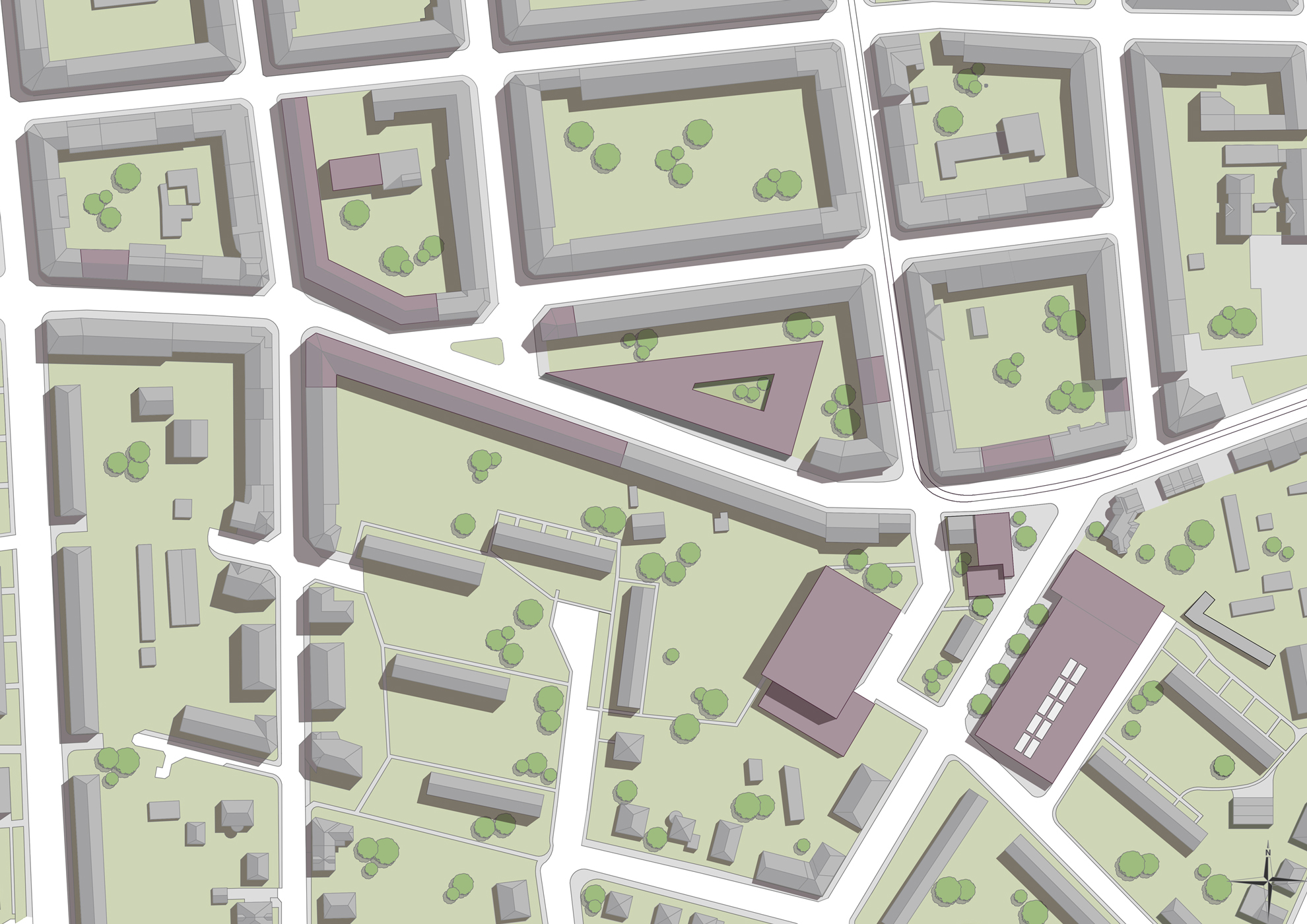 Hauptaugenmerkmal hierbei sind moderne, geometrisch fungierende Gebäude, welche die doch sehr angejahrt wirkende Umgebung durch ihre Form und Farbe aufpeppen sollen. Darunter verstanden wird unter Anderem ein Kulturzentrum, das für Konzerte, kulturelle und soziale Veranstaltungen genutzt wird, ein Bürogebäude mit unterschiedlich großen Büro- und Konferenzräumen, ein Parkhaus, das 24 Stunden am Tag über die neugebaute Straße befahren werden kann und 300 Stellplätze bietet und ein 3250m² großes Sportzentrum, in dem sich eine Sporthalle, ein öffentlich nutzbares Schwimmbad und eine Gallerie mit Cafeteria befindet.