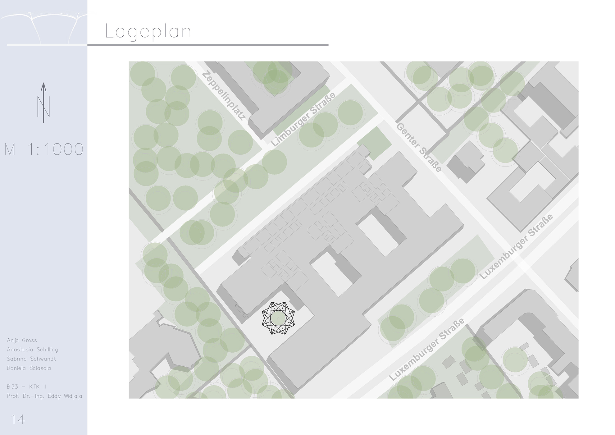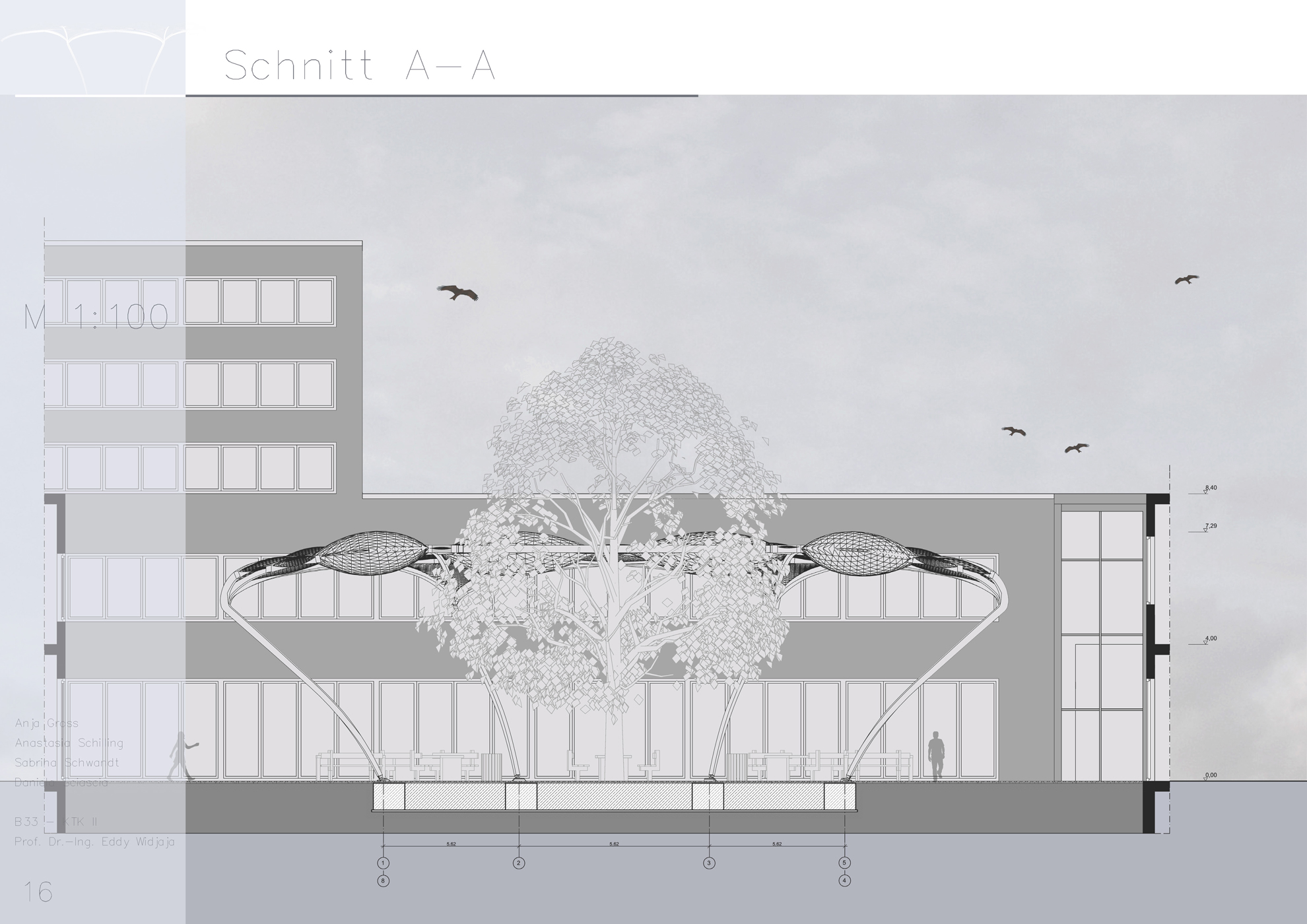 Im Rahmen des Moduls - Komplexe Tragsysteme und Konstruktion II wurde unter der Leitung von Prof. Dr.-Ing. Eddy Widjaja eine Überdachung am Haus Bauwesen der Beuth Hochschule für Technik entworfen. Es wurde eine freistehende Dachstruktur geplant, die statisch und gestalterisch unabhängig vom Bestandsgebäude ist, sowie eine transluzente Dachhaut mit Solarzellen, um Stromversorgung für Beleuchtung, Laptops und Mobiltelefone zu gewährleisten. Diese Arbeit beinhaltet wesentliche Entwurfsetappen (Entwurfsvarianten für das Tragwerk, Vordimensionierung der tragenden Bauteile bzw. Analyse der Tragwerke mit einem Stabwerksprogramm "STAB2D", Beschreibung des Bauablaufs, alle wesentliche Pläne, Tragwerksdetails, Tragwerksmodell) und wurde in einer Gruppe mit 4 Personen ausgearbeitet.